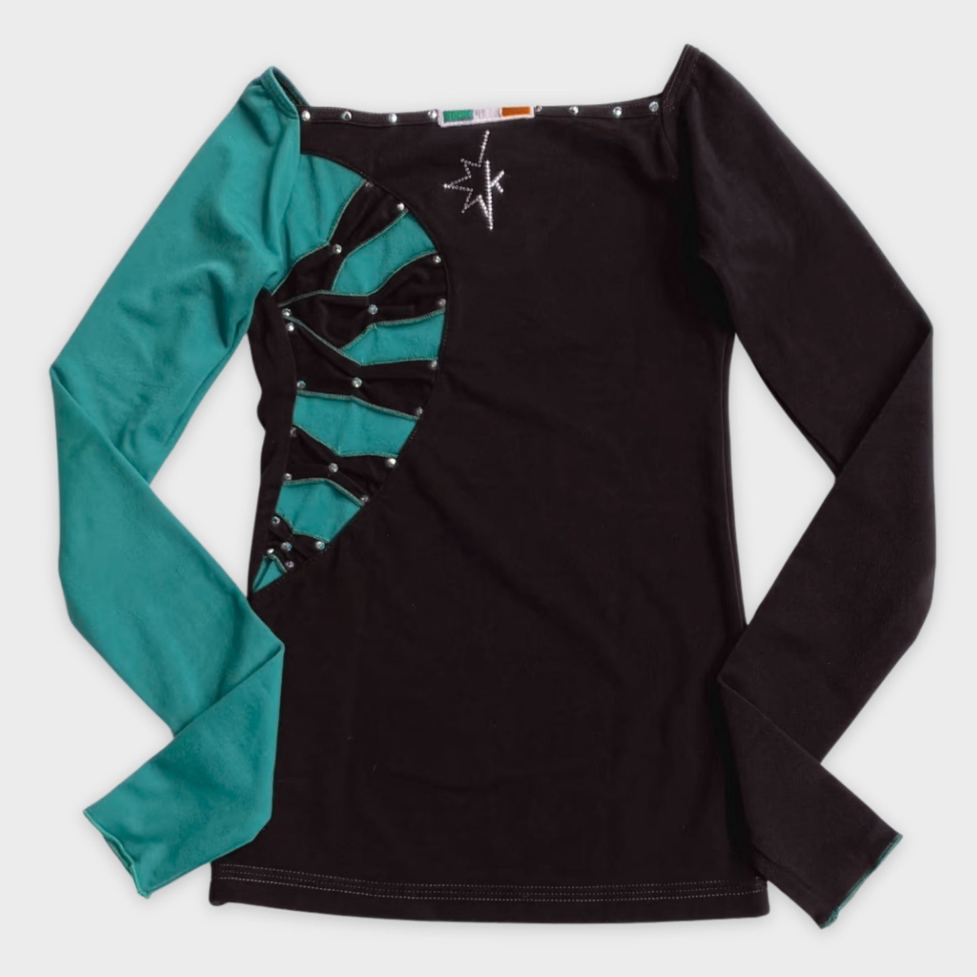 Boat-neck shirt with a crescent back insert and five bow overlays in a contrasting color. Swarovski® crystals tracing the edges of the neckline and bows.